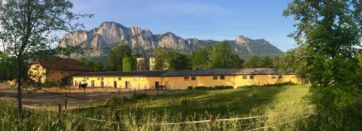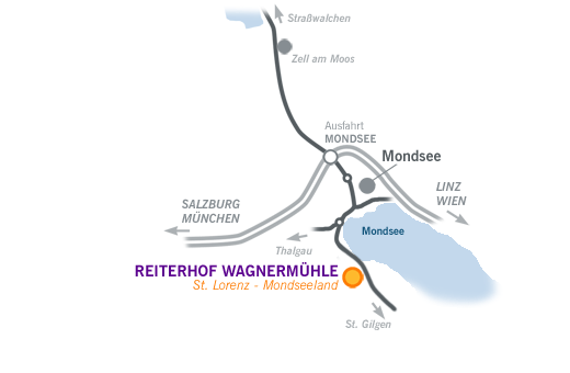 | ANFAHRT: Von Mondsee Richtung St. Gilgen fahren - nach ca. 4 km rechts abbiegen (zwischen dem Golfplatz und der Firma "Camaro"). Dann noch ca. 300 m gerade aus. Auf der rechten Seite sieht man schon das Stallgebäude. |